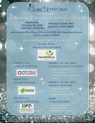 By registering for this event, you consent that photos and videos of you at the event may be published in print or posted online in online photo albums; photo/video-sharing sites such as YouTube, social media sites such Facebook, Instagram and LinkedIn; and in other web-based media at the sole discretion of the Post Falls Chamber of Commerce.
