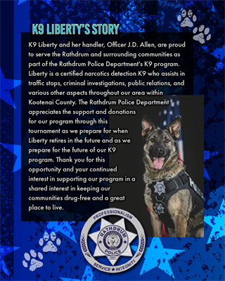 K9 Liberty and her handler, Officer J.D. Allen, are proud to serve the Rathdrum and surrounding communities as part of the Rathdrum Police Department's K9 program. Liberty is a certified narcotics detection K9 who assists in traffic stops, criminal investigations, public relations, and various other aspects throughout our area within Kootenai County. The Rathdrum Police Department appreciates the support and donations for our program through this tournament as we prepare for when Liberty retires in the future and as we prepare for the future of our K9 program. Thank you for this opportunity and your continued interest in supporting our program in a shared interest in keeping our communities drug-free and a great place to live.