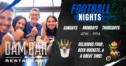Catch all the football action at The DAM Bar & Restaurant located inside Templin's Hotel on the River! Join us every Sunday, Monday, and Thursday from 4 PM – 9 PM for great food, ice-cold drinks, and unbeatable river views. Enjoy beer bucket specials, game day bites, and plenty of TVs so you never miss a play. Bring your friends, wear your team colors, and cheer on your favorite team at the best football hangout in Post Falls!